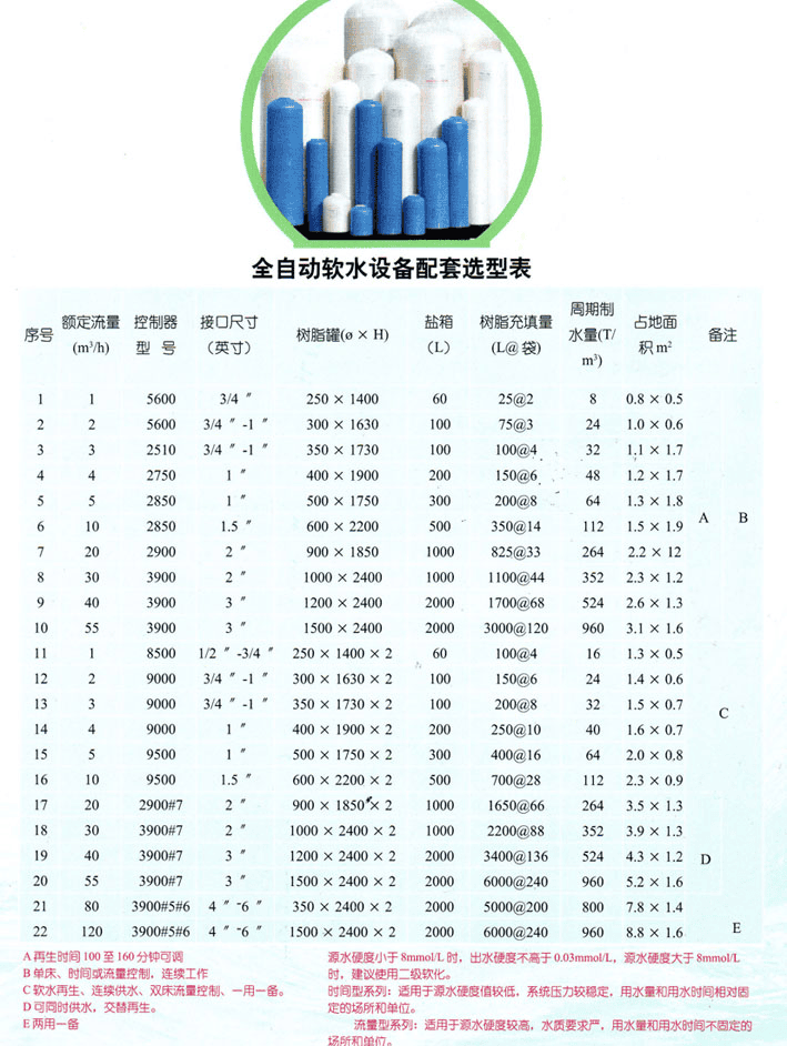 软化水设备简介:软化水设备也称为软化水处理装置、全自动软水器、软水机、软化水处理设备、水软化器。软化水设备是由全自动软水控制器(美国FLECK富莱克、AUTOTROL阿图祖控制器)、树脂罐(一般为玻璃钢树脂罐和不锈钢树脂罐)、强酸型钠离子阳树脂、盐箱以 及软水器配件组成。通过流量和时间控制方式发出指令给多路通伺服阀或电磁阀,来完成软化水设备的供水及再生,是工业锅炉、冷却循环水、炼钢、轧钢、大型变压 器、民用热水锅炉等场合中应用最为广泛的硬水软化处理设备。